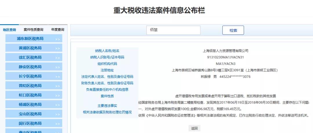 5、上海XX人力資源管理有限公司,經(jīng)國家稅務(wù)總局上海市稅務(wù)局第二稽查局檢查,發(fā)現(xiàn)其在2017年06月19日至2018年09月30日期間,主要存在以下問題:對外虛開增值稅銷項(xiàng)發(fā)票100份,金額996.98萬元,稅額169.49萬元。依照《中華人民共和國稅收征收管理法》等相關(guān)法律法規(guī)的有關(guān)規(guī)定,已作出稅務(wù)行政處理決定,并依法移送司法機(jī)關(guān)。